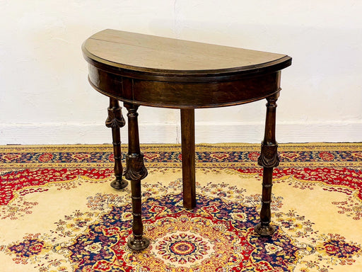 イギリスよりオークのダークオークのゲームテーブル。普段は壁付けのコンソールテーブルとして。中央後方の脚を引き延ばして天板を開くとカードゲームに様変わりします。使い込まれた質感にランプシェードのような珍しい脚の装飾など、アンティークとしての魅力が詰まったゲームテーブルです。ゲームテーブルd44情...