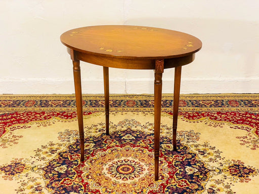 ペイントが施されたオーバルのティーテーブル。飴色の木の表情と、流れるような曲線のシェイプ。様々な用途で使えるサイズも嬉しいポイントです。ペインテッドティーテーブルd252情報サイズ:D51W74H70cm原産国:イギリス年代:1950年頃 素材:ウォールナット配送区分:Eコンディション:【アン...