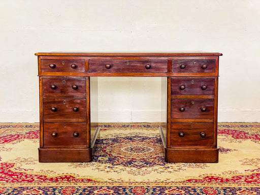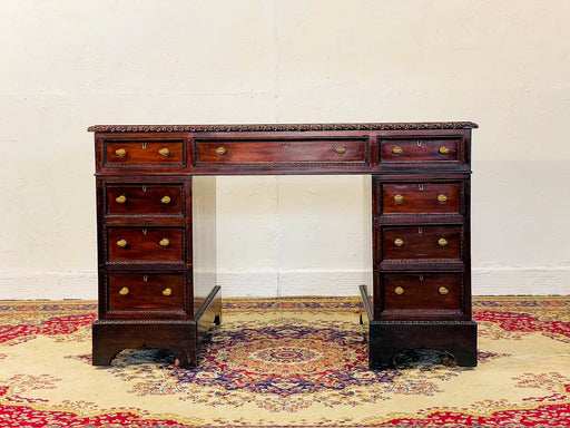 赤いレザートップのライティングデスク。天板のエッジには立体的で質の高いガドルーン、引き出しの縁のコックビーディングにも質の高い彫刻装飾が施されています。移動も楽なぺディスタル(両袖)型で現代でも使い勝手の良い仕様です。鍵は左最下段のみ使用不可です。ライティングデスクe212情報サイズ :D64...