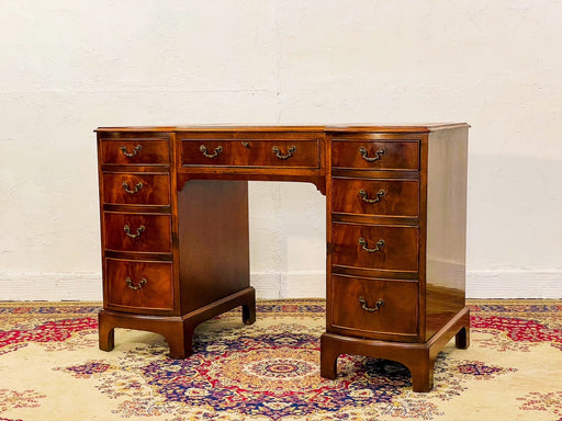 レザートップのライティングデスク。マホガニーの揺らいだような木目と両サイドのふくらみで柔らかな印象。直線的で硬い印象の多いニーホールデスクでは希少なプロポーション。背面も仕上げが乗っているタイプなので配置場所・向きを自由にお使い頂けます。ニーホールデスクe90情報サイズ :D58.5W117....