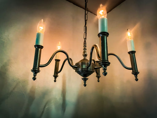 シルバープレート(銀メッキ)の5灯シャンデリアです。 プレーンで綺麗なボディに細かい彫りがアクセント。 どこに付けても邪魔をしない使いやすいデザインです。 ※当店のシャンデリアは日本ですぐにご使用いただけるようにソケットを取り付けておりますが、そのままの取り付けだと天井とのカップ金具の間に隙間...